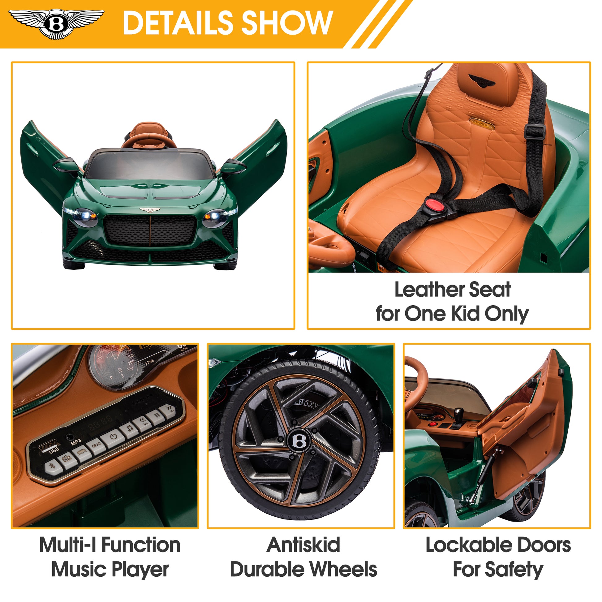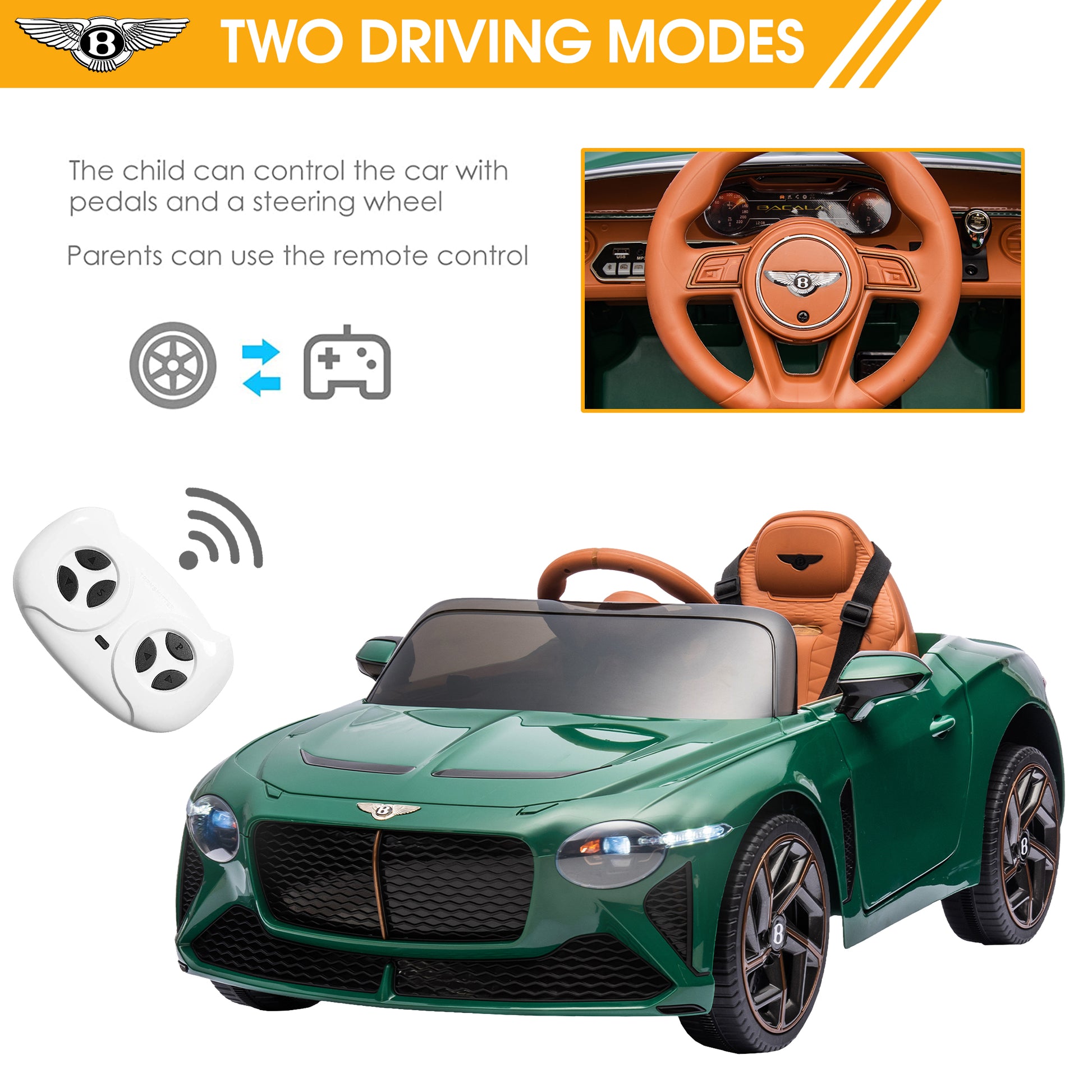 The Official Licensed Bentley Mulsanne ride on cars has a smooth line and cool look with an unparalleled sense of style. This ride on cars features a larger seat, large weight capacity, and adjustable safety seat belts. Ride-on cars integrate real engine sound, horn, and LED light Push-button start separates. USB and MP3 ports allow you to add music to the fun. Two driving modes allow you to have fun with your child and at the same time make sure they are safe. This ride on cars is a wonderful gift for your boys or girls. This ride on cars is suitable for ages 3-5 years.