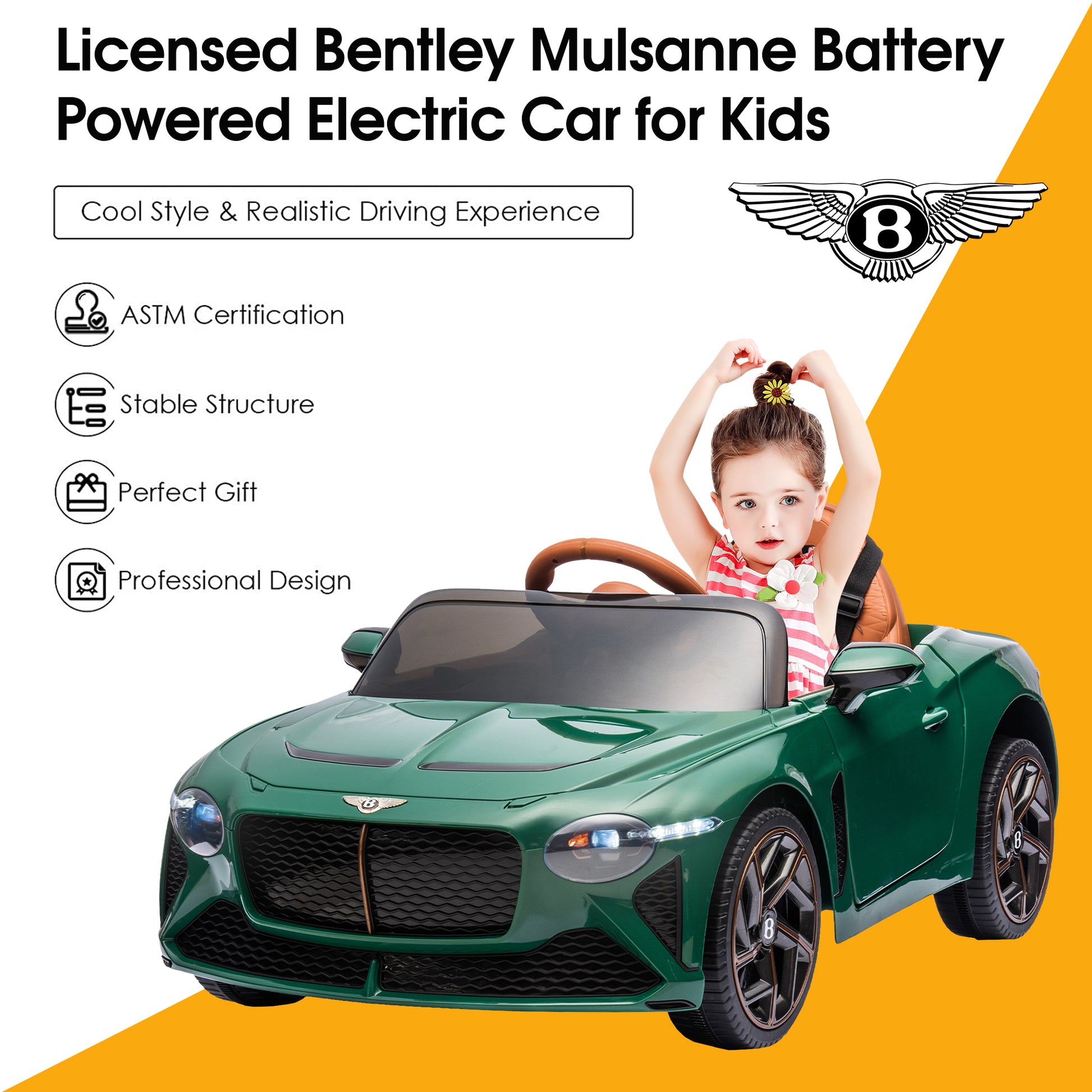 12V Ride On Car with Remote Control, Licensed Bentley Mulsanne Kids Electric Car with Bluetooth, Music, USB, MP3, LED Light, Battery Powered Electric Ride On Vehicle for Boy Girl Birthday Gift, Green