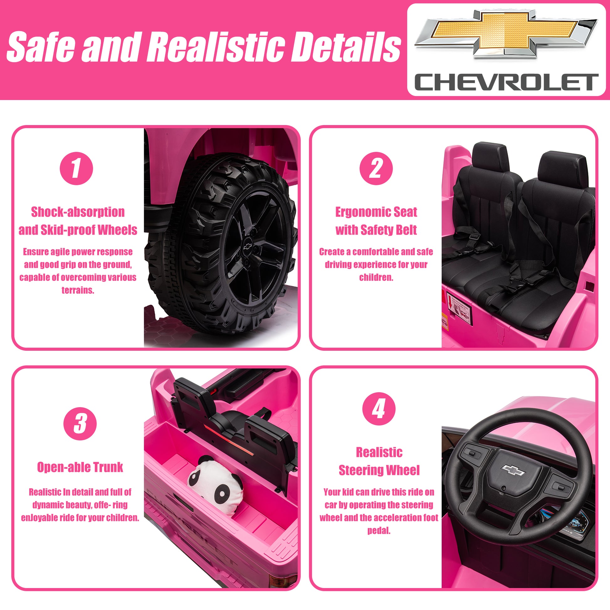 This 24V 2 seater kids ride on car is crafted with a durable, non-toxic PP body and wear-resistant wheels and is available for long-term outdoor and indoor use. Realistic design, and a cool appearance, is equipped with a music and music player, and is easy to operate by kids, and parents also can control the car by remote control when necessary. This ride on truck cars brings fun and happiness to children in a safe environment and creates special memories for your children in their childhoods. Just place the Licensed Chevrolet Silverado 24v ride on car as the perfect gift for your kids and let the fun begin!