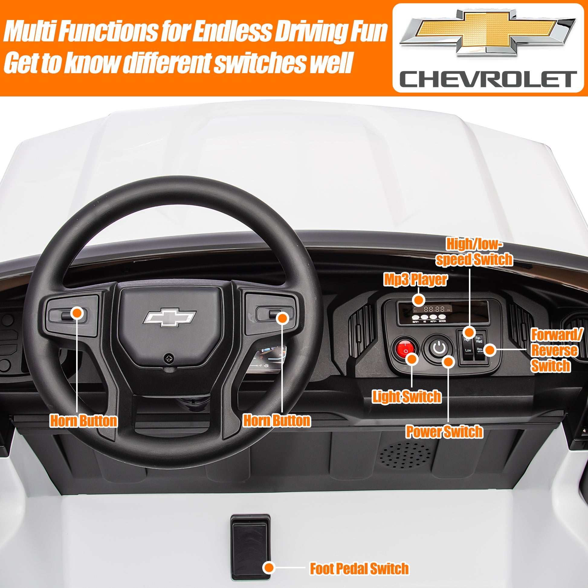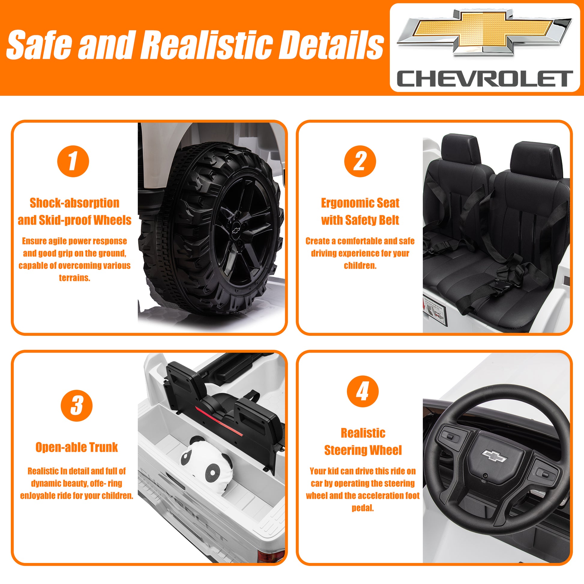 This 24V 2 seater kids ride on car is crafted with a durable, non-toxic PP body and wear-resistant wheels and is available for long-term outdoor and indoor use. Realistic design, and a cool appearance, is equipped with a music and music player, and is easy to operate by kids, and parents also can control the car by remote control when necessary. This ride on truck cars brings fun and happiness to children in a safe environment and creates special memories for your children in their childhoods. Just place the Licensed Chevrolet Silverado 24v ride on car as the perfect gift for your kids and let the fun begin!
