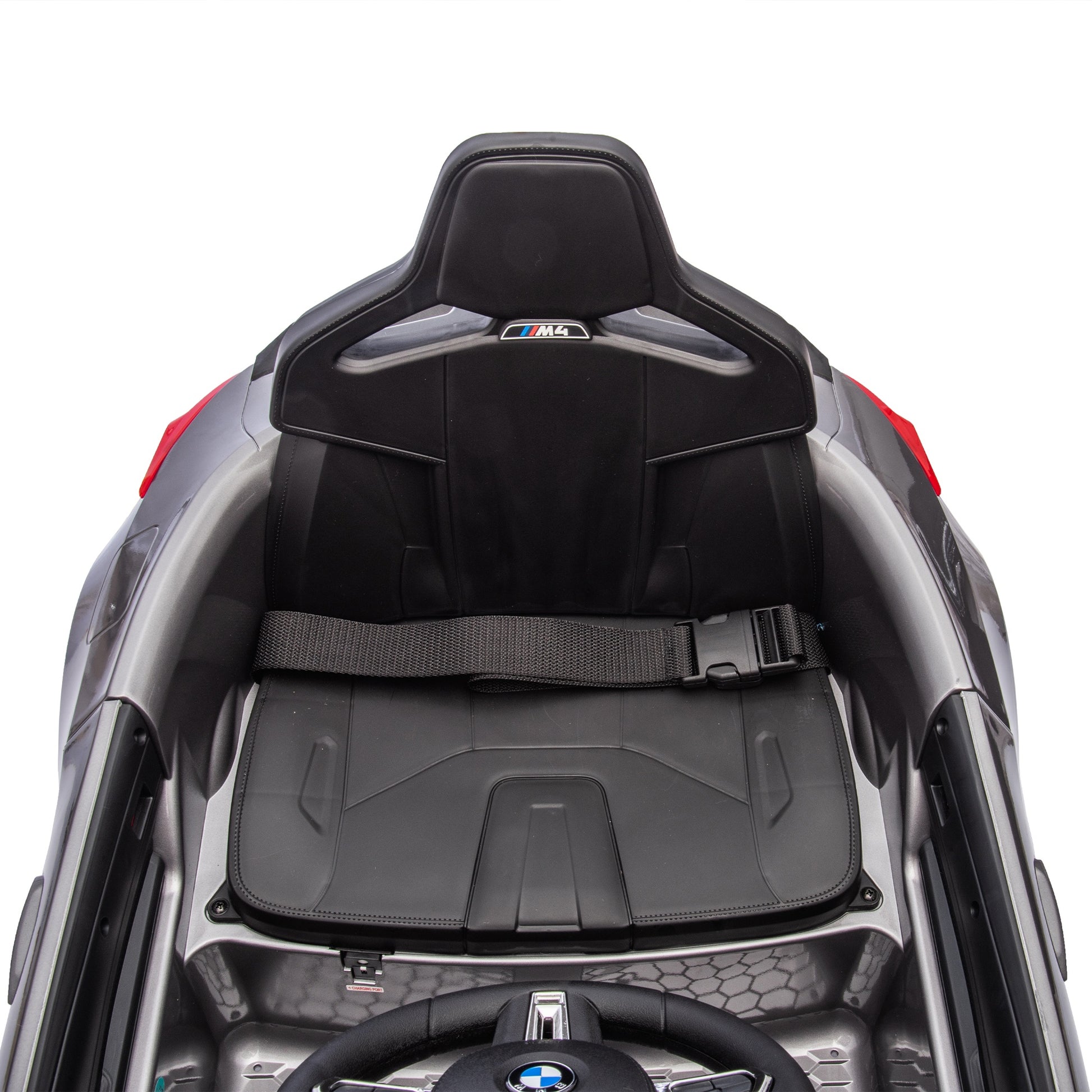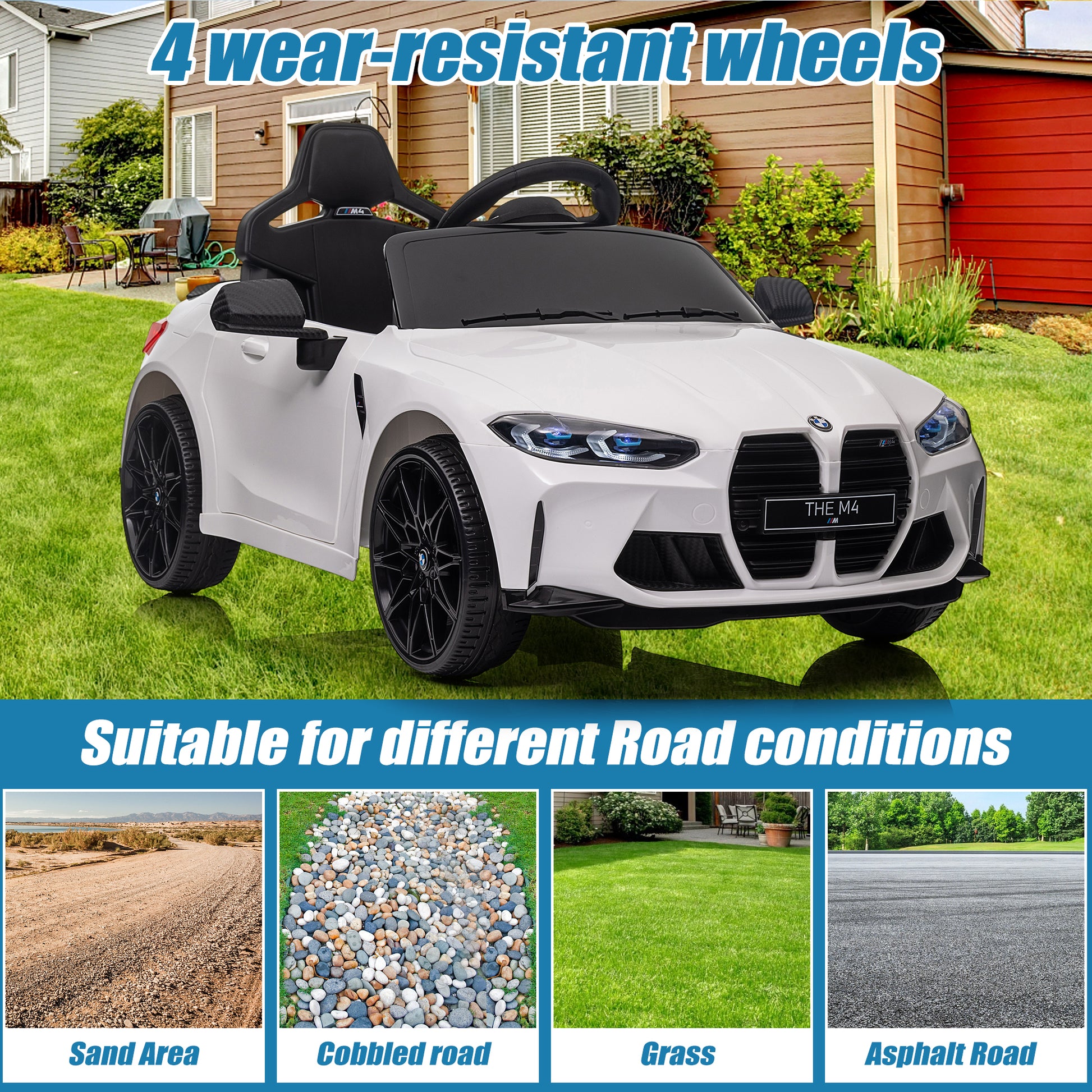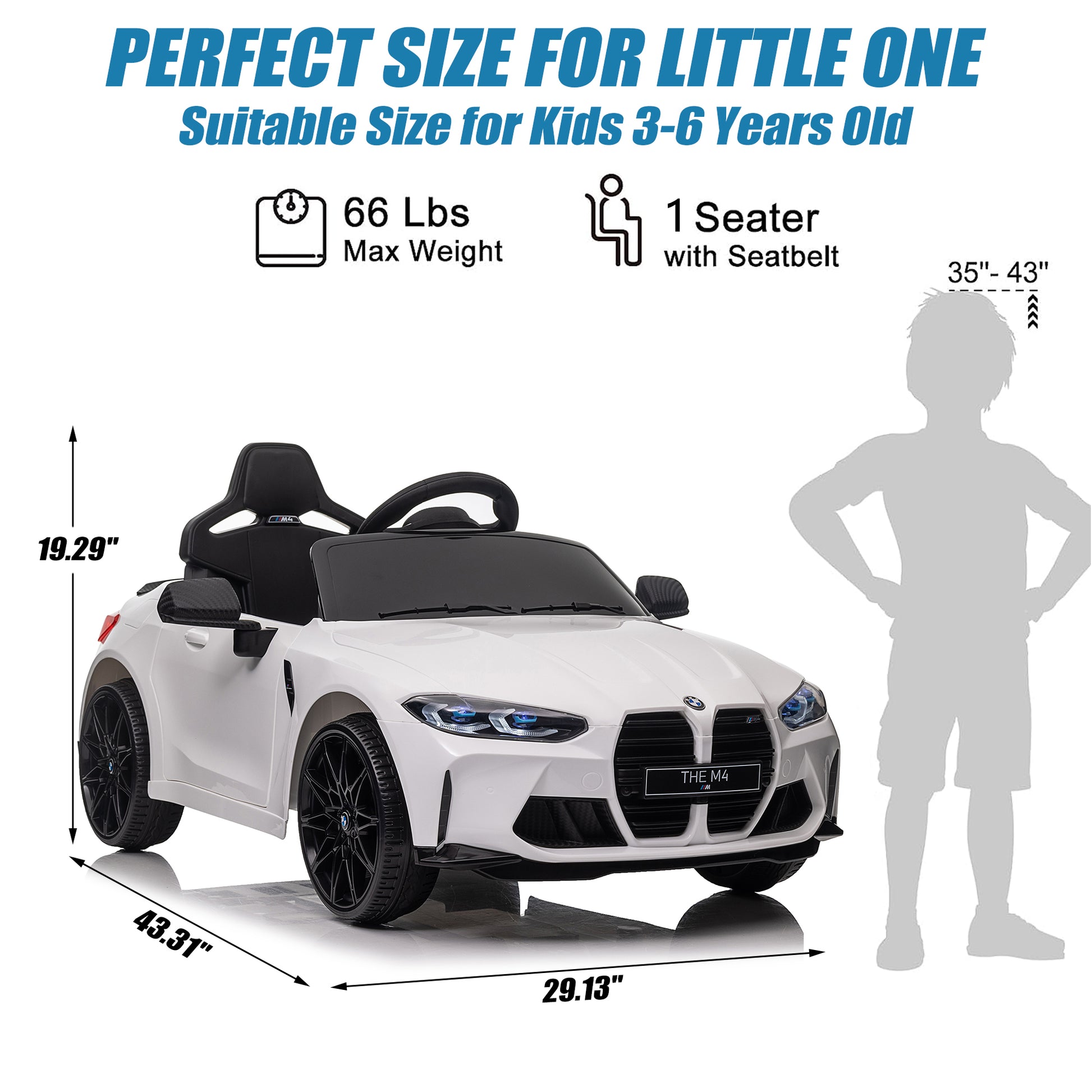 BMW M4 12v Kids Ride On Toy Car with 2.4G Parents Remote Control, Three Speed Adjustable, Power Display, USB, MP3, Bluetooth, LED Light, Story, A Handle with Wheels and A Pull, Easy To Carry