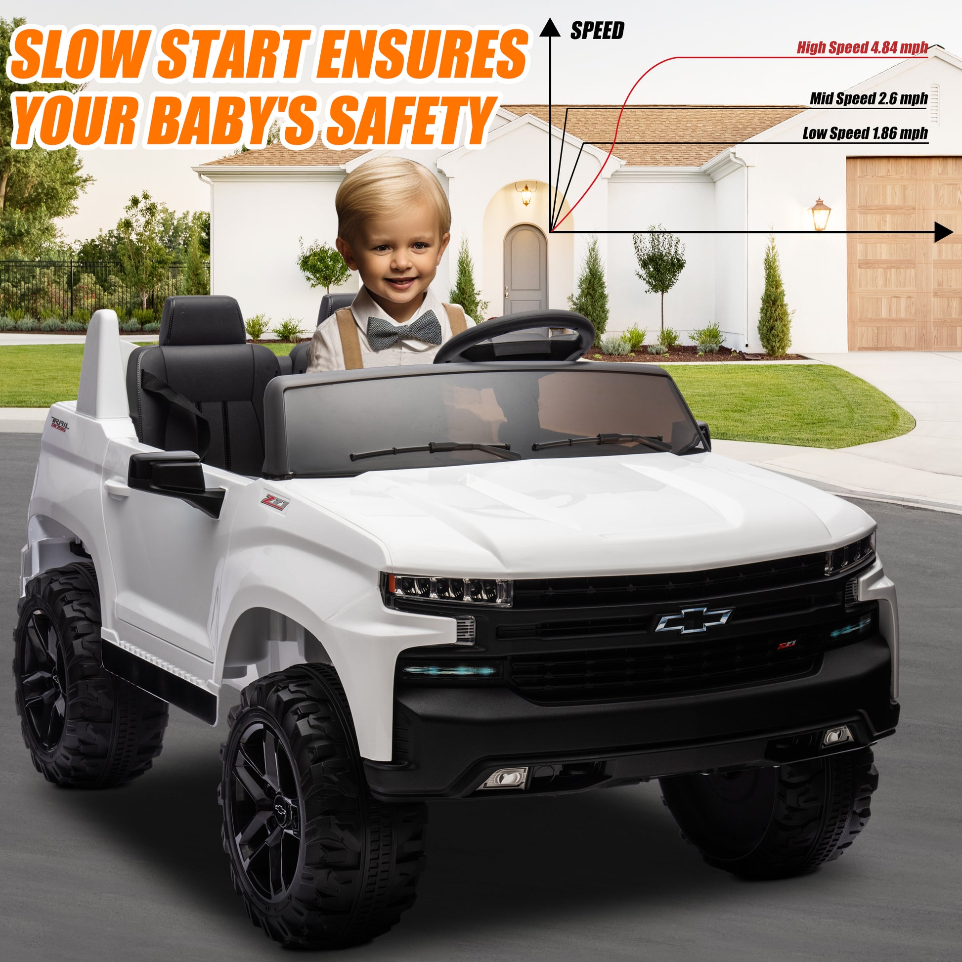 This 24V 2 seater kids ride on car is crafted with a durable, non-toxic PP body and wear-resistant wheels and is available for long-term outdoor and indoor use. Realistic design, and a cool appearance, is equipped with a music and music player, and is easy to operate by kids, and parents also can control the car by remote control when necessary. This ride on truck cars brings fun and happiness to children in a safe environment and creates special memories for your children in their childhoods. Just place the Licensed Chevrolet Silverado 24v ride on car as the perfect gift for your kids and let the fun begin!
