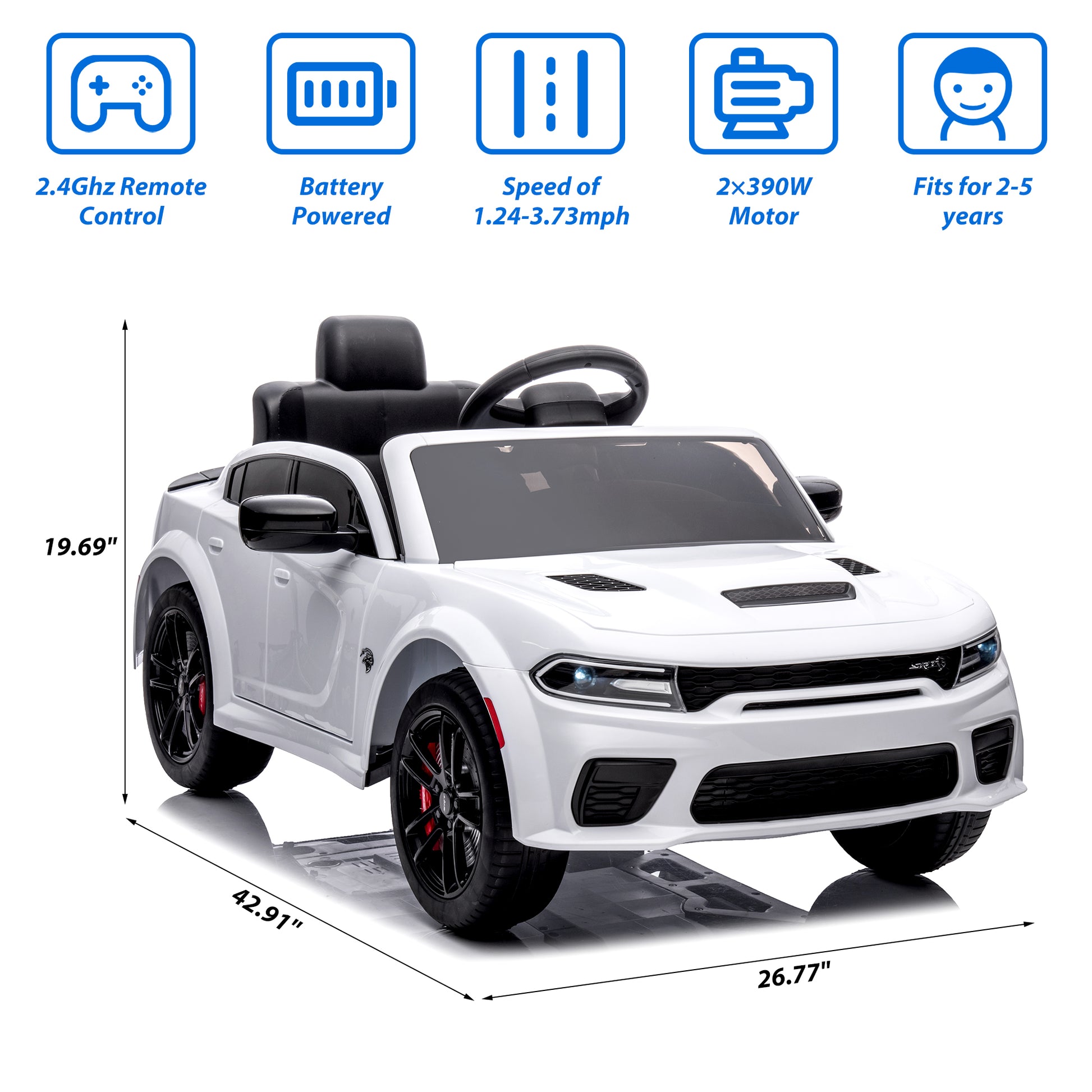 The iRerts Official Licensed Dodge Charger 12v ride on car boasts sleek lines and a cool aesthetic, making it a stylish choice for young drivers. This kids ride on car features a spacious seat, high weight capacity, and adjustable safety seat belts. With realistic engine sounds, a horn, power display, slow start, USB, MP3, Bluetooth, and LED lights, this kids ride on car is packed with exciting features. The push-button start allows for easy operation, and two driving modes ensure both fun and safety for your child. This kids ride on car makes a fantastic gift for boys and girls alike, and is suitable for children aged 3-5 years old.