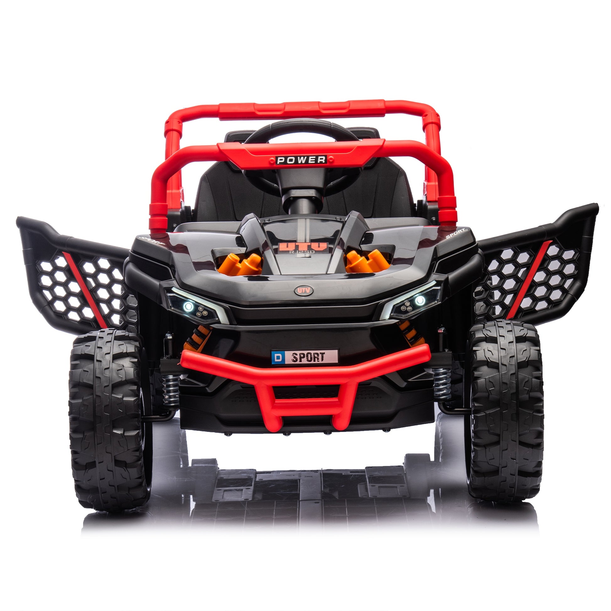 The iRerts 24v electric ride on toy UTV with remote control brings endless joy to children, with parents able to easily control it via remote, ensuring safety. Features like high and low-speed modes, cool LED lights, one-button start, Bluetooth, music player, and early education content make driving fun and engaging. Additionally, the four-wheel suspension system and convenient rear storage compartment ensure a smooth and comfortable ride, allowing children to explore various terrains and enjoy every adventure.